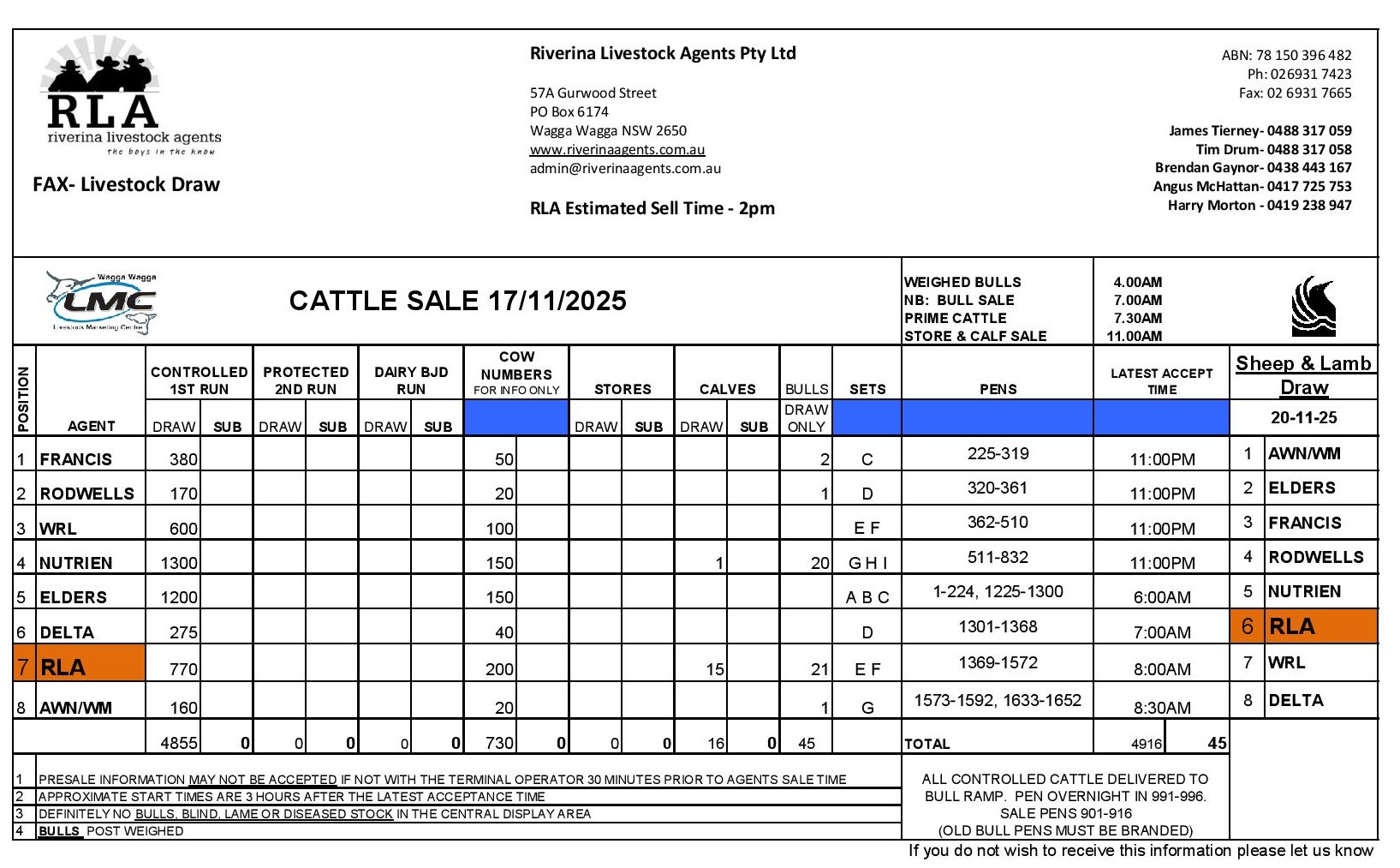 Wagga Cattle Draw 17/11/2025